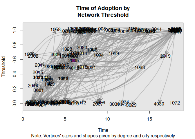 plot(out, color=viridisLite::inferno(5), las = 2, xlab="Time of Adoption",