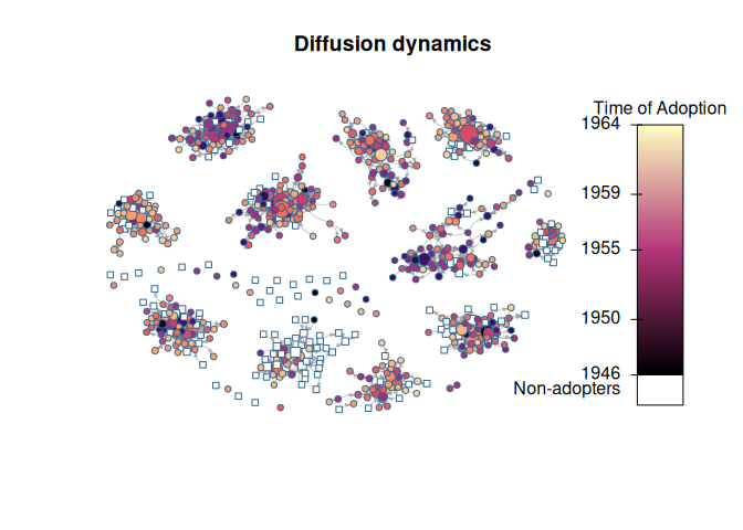 The package was developed as part of the paper Thomas W. Valente, Stephanie R. Dyal, Kar-Hai Chu, Heather Wipfli, Kayo Fujimoto, Diffusion of innovations theory applied to global tobacco control treaty ratification, Social Science & Medicine, Volume 145, November 2015, Pages 89-97, ISSN 0277-9536 (available here).