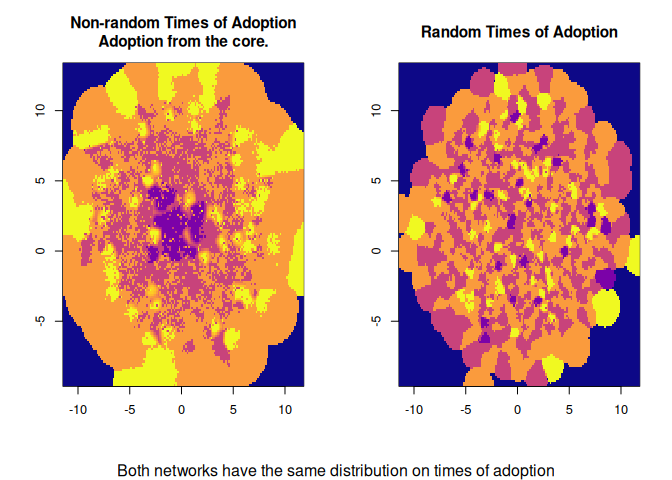 image(dm0, col=col, main="Non-random Times of Adoption\nAdoption from the core.")